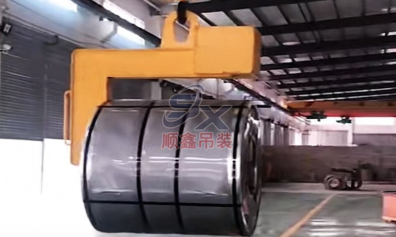 C型吊具適用于鋼卷的水平吊運,由吊具體和配重鐵組成。主體部分由合金鋼和鋼管拼接而成,截面為箱型結(jié)構(gòu),配重鐵起調(diào)節(jié)吊具平衡的作用,使吊具和被吊物的重心在一條線內(nèi)。載荷范圍:3.2-32噸。